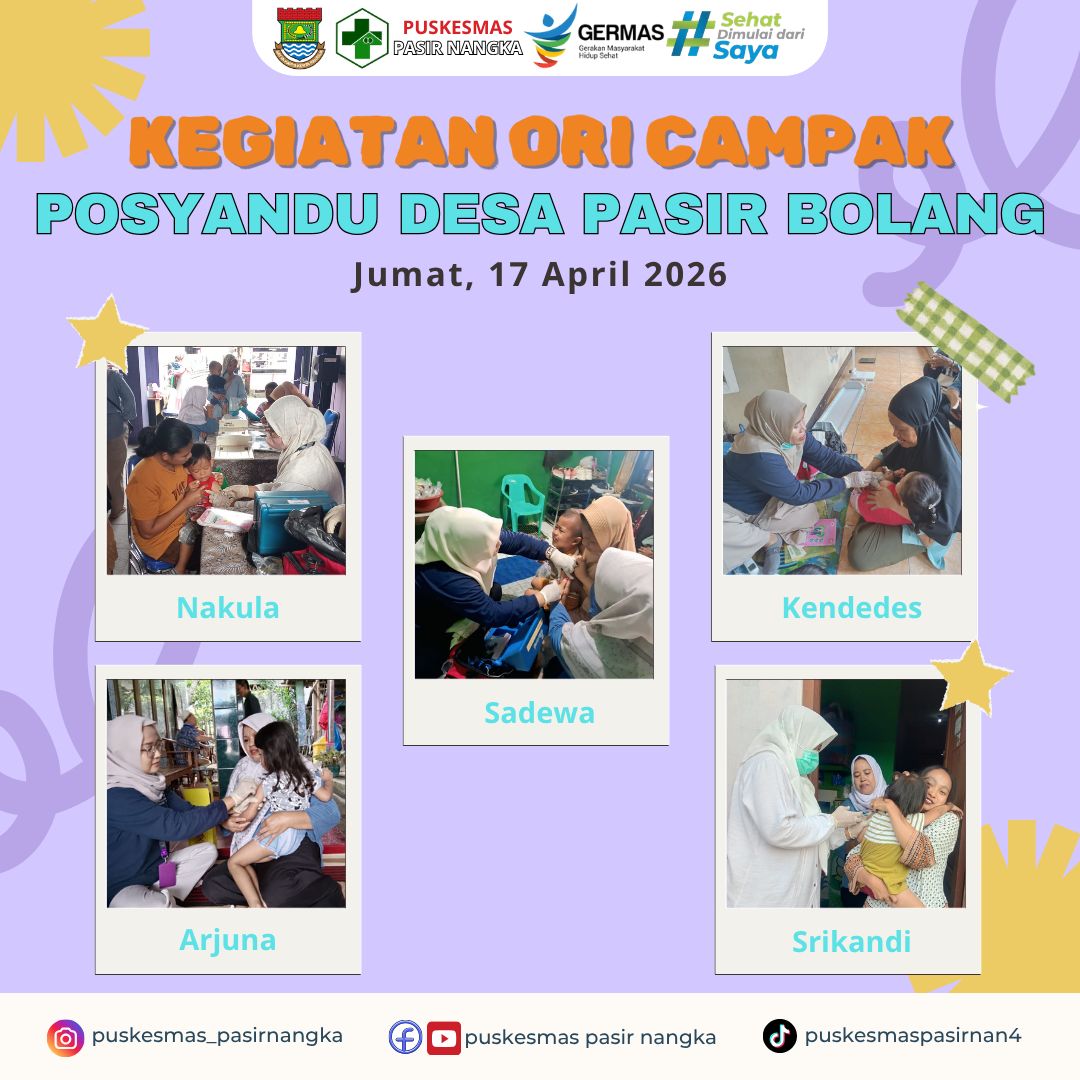 Puskesmas Pasir Nangka kembali melaksanakan kegiatan Outbreak Response Immunization (ORI) Campak pada Jumat, 17 April 2026 di Desa Pasir Bolang. Kegiatan ini dilaksanakan secara serentak di seluruh posyandu yang ada, yaitu Posyandu Nakula, Sadewa, Kendedes, Arjuna, dan Srikandi, dengan sasaran bayi dan balita usia 9–59 bulan.