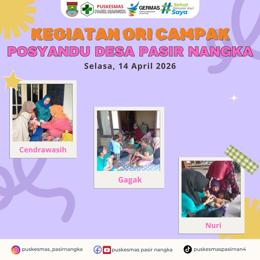 Puskesmas Pasir Nangka melaksanakan kegiatan Outbreak Response Immunization (ORI) Campak di Desa Pasir Nangka sebagai upaya pencegahan dan pengendalian penyebaran penyakit campak pada anak. Kegiatan ini menyasar bayi dan balita usia 9 sampai 59 bulan tanpa memandang status imunisasi sebelumnya. ORI Campak hari terakhir di Desa Pasir Nangka akan dilaksanakan tanggal 18 April 2026 yang menyasar Posyandu Merak, Parkit, dan Rajawali.